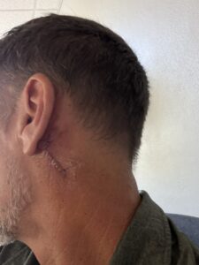 Now things were not all great with him either as he was the one that did the spot on my hairline that got infected and did not close up well. That spot took the longest time to heal of any I have ever had cut out. But hey, at least he did so so work, fast. When I was diagnosed with this new spot I was told that the guy I had was no longer there, he moved back to Kentucky so I was going to be assigned somebody new.